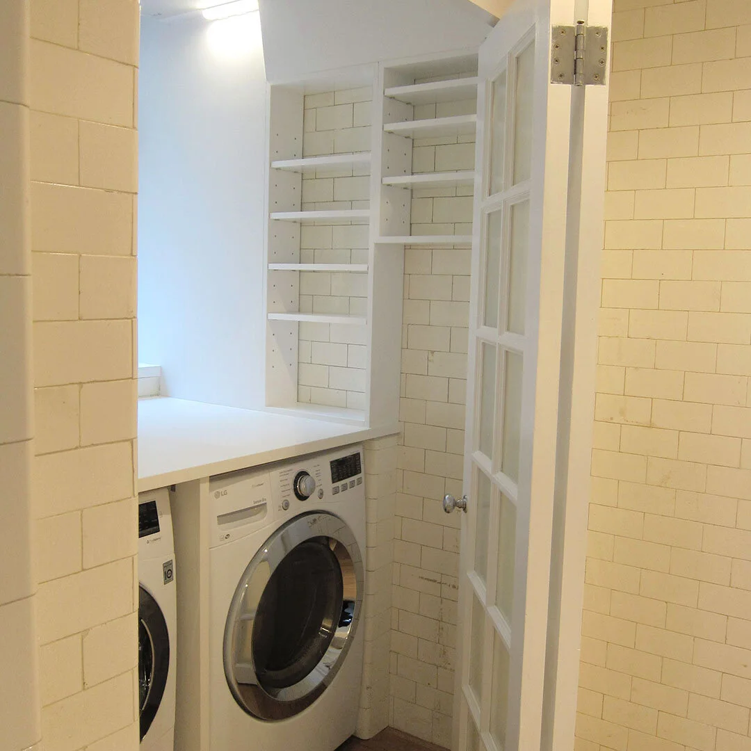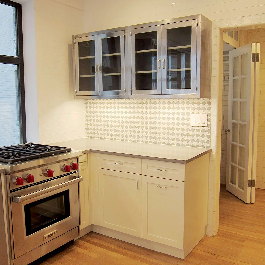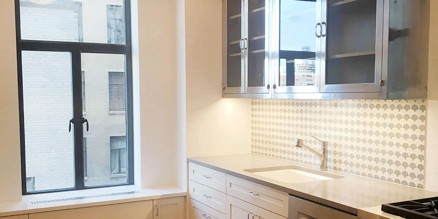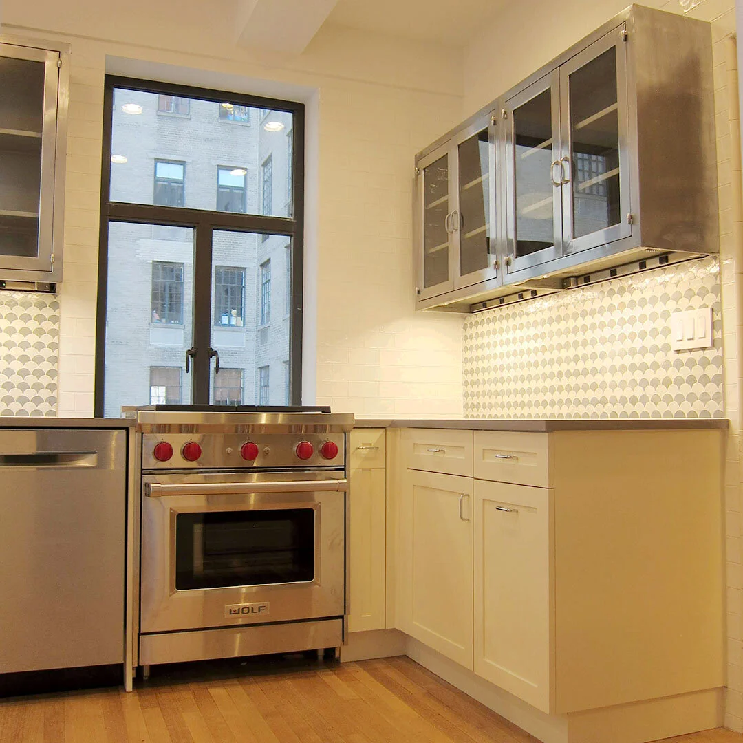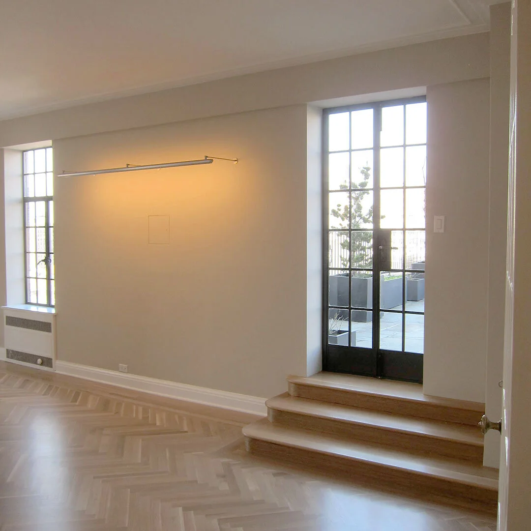 The replacement of the historic steel sash windows prompted this client to update this prewar apartment. The project included a kitchen renovation that transformed it into a functional and airy room. The refinishing of the original wood floors sealed with a clear stain, painting the walls warm tranquil neutrals, and the installation of new lighting throughout the apartment brightened the space while maintaining a tranquil feeling. New carpeting infused color into the palette.